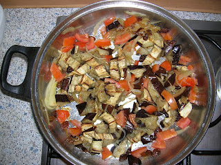 sütőben 180 fokon 40 perc alatt a padlizsánt készre sütöttem. Ehhez négyfelé vágtam és sóztam, borsoztam. A hagymát megpirítottam sóztam, borsoztam, rá a kömény, majd a kimagozott paradicsomgerezdeket hozzáadtam a mazsolával együtt, majd rá a kész padlizsánt és meglocsoltam a citrommal. Mehet is az asztalra. :)